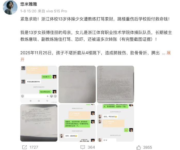 近日,浙江体育职业手艺学院一位13岁体操活动员坠楼事务激发舆论存眷。活动员家长指认其坠楼缘由是持久蒙受锻练体罚、索财激发,成为公家存眷的核心。